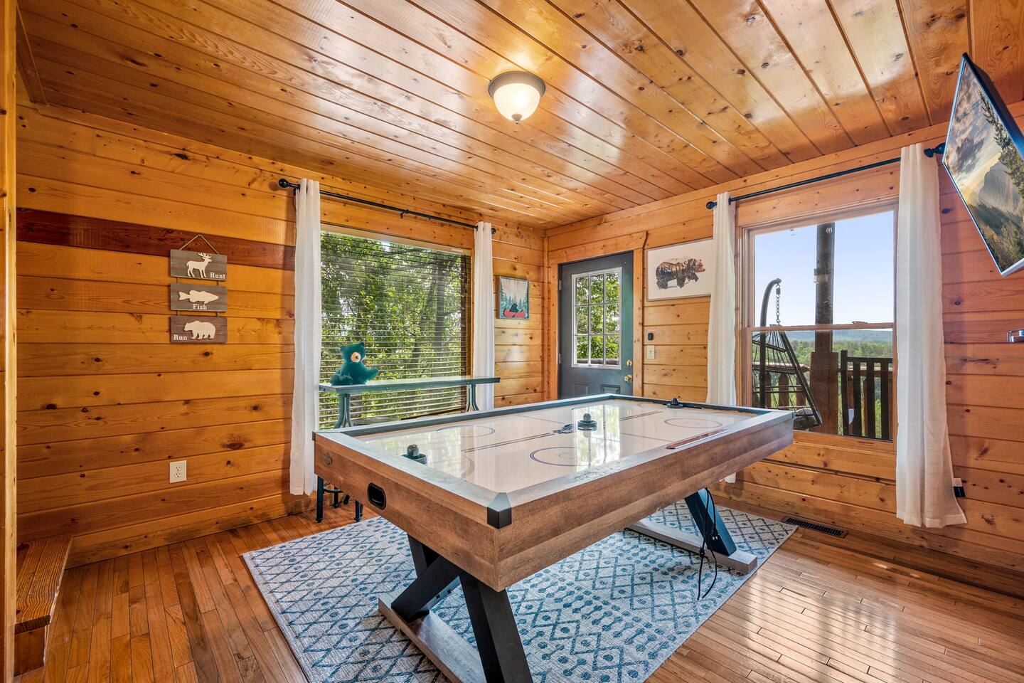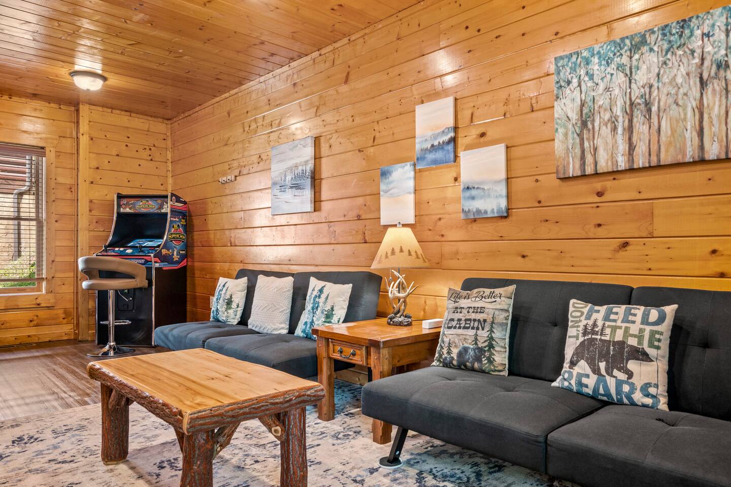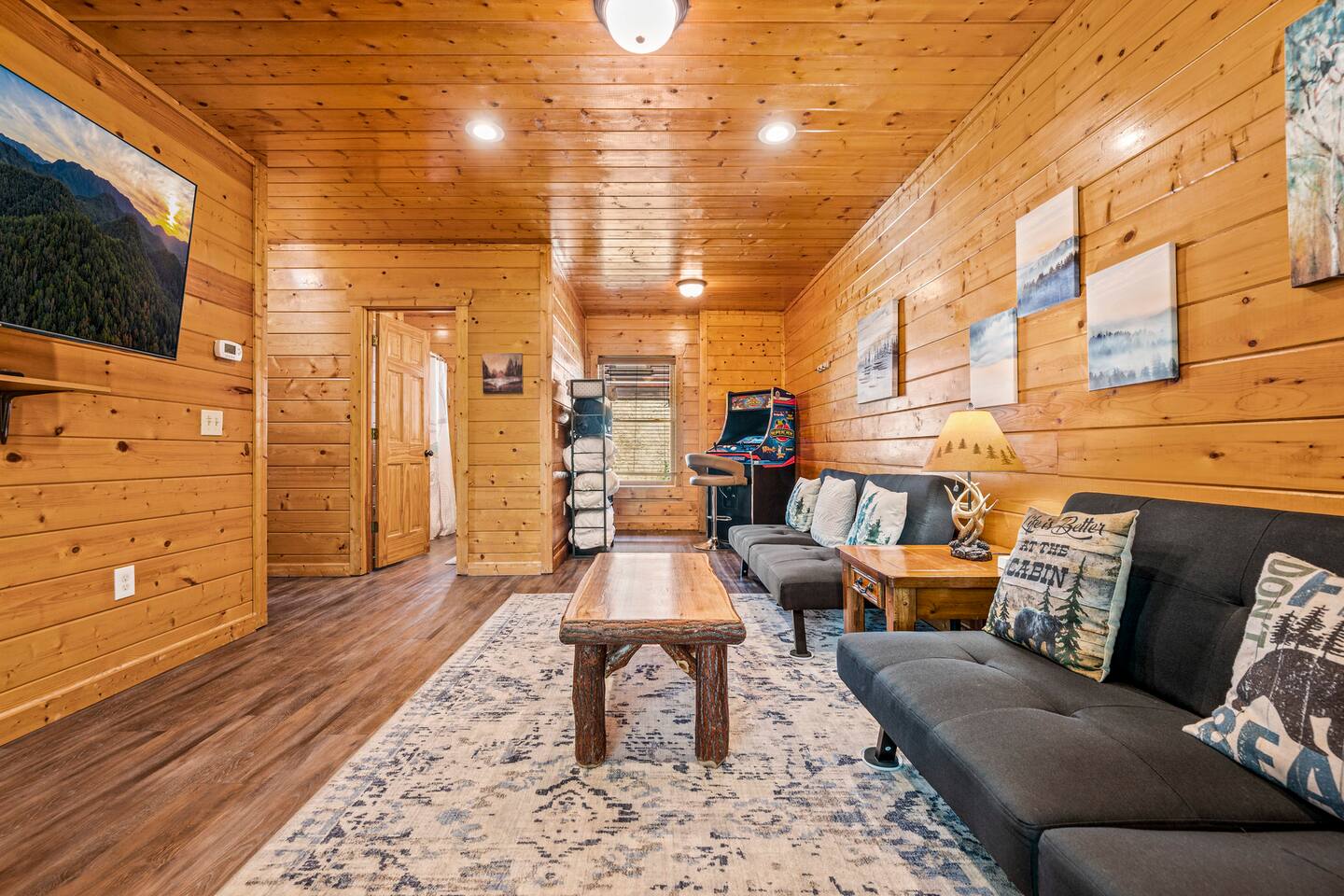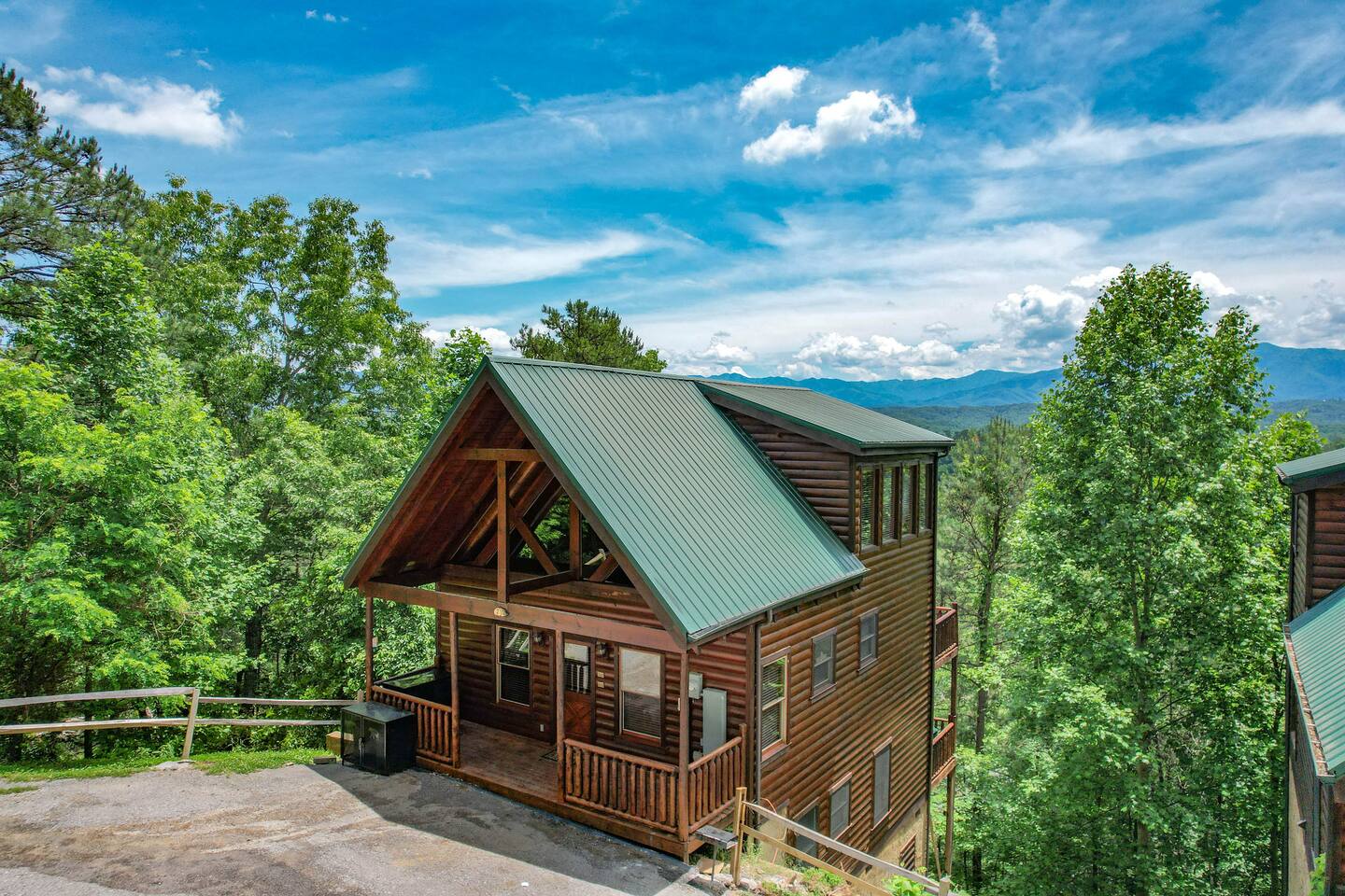 - 4-bedroom cabin with breathtaking views! - Sleeps 12 guests - Hot Tub - 10 minutes from all the action on the Parkway - Air Hockey table, Arcade Game, Smart TV's - High Speed WiFi - 3 Decks with amazing views - 3 King Beds, 1 Queen Bed, and 3 Sleeper Sofas - Fully equipped kitchen Prime location, yet nestled in the heart of nature, this cabin is the perfect retreat for families and groups looking for a peaceful and relaxing getaway. You and your family or group of 12 guests are going to love this cabin as it can accommodate a nice social gathering yet ensure the privacy you need while on vacation. Book now to experience the Smoky Mountains and all it has to offer with these incredible views. Conveniently located near Dollywood, Pigeon Forge and Gatlinburg, this 3 story home offers an Air Hockey Table, Arcade Game, 7 Smart TV's, and 3 decks to enjoy your Smokey Mountain Getaway from. The views are incredible from all three decks, which you can enjoy while relaxing in the 6 person hot tub, or from the Adirondack chairs with a nice beverage. The brand new hot tub is located out on the deck with a great view. It is drained, cleaned, and refilled before every stay. Inside, the cabin is fully furnished and equipped with all the amenities you need for a comfortable stay. The four bedrooms are cozy and inviting, with comfortable beds. The master bedroom even has its own private balcony, This home boasts a large master bedroom which encompasses the entire third floor, with more views, a king sized bed, jacuzzi tub, and a private balcony, perfect for enjoying a nightcap under the stars. The mainfloor features an open family room with a brand new large flatscreen Smart TV and sleeper sofa, fireplace, air hockey table, one queen bedroom and access to the balcony. On the lower level, you will find 2 king bedrooms, a tv/game room, and our deck with a hot tub. We have high Speed Xfinity Business Wifi, and Smart TV's located in every room for your enjoyment. Sleeping arrangements throughout the home includes 3 king beds (1 on the top floor, and 2 on the lower level), 1 queen bed (on the main floor), and 2 sofa beds (one on the main floor and one on the lower level) with linens and towels included. We also love kids, so we have stocked the home with a pack and play for your little one to sleep in, and a highchair so they can join you at the dinner table. The kitchen is fully equipped with modern appliances and everything you need to whip up a delicious meal for your family or friends. We also stock the home with soap and shampoo in every bathroom for your convenience. We have 2 charcoal grills available for use. With its stunning views, modern amenities, and unbeatable location, this 4-bedroom cabin is the perfect place to unwind and reconnect with nature. Book your stay today and start planning your dream vacation!