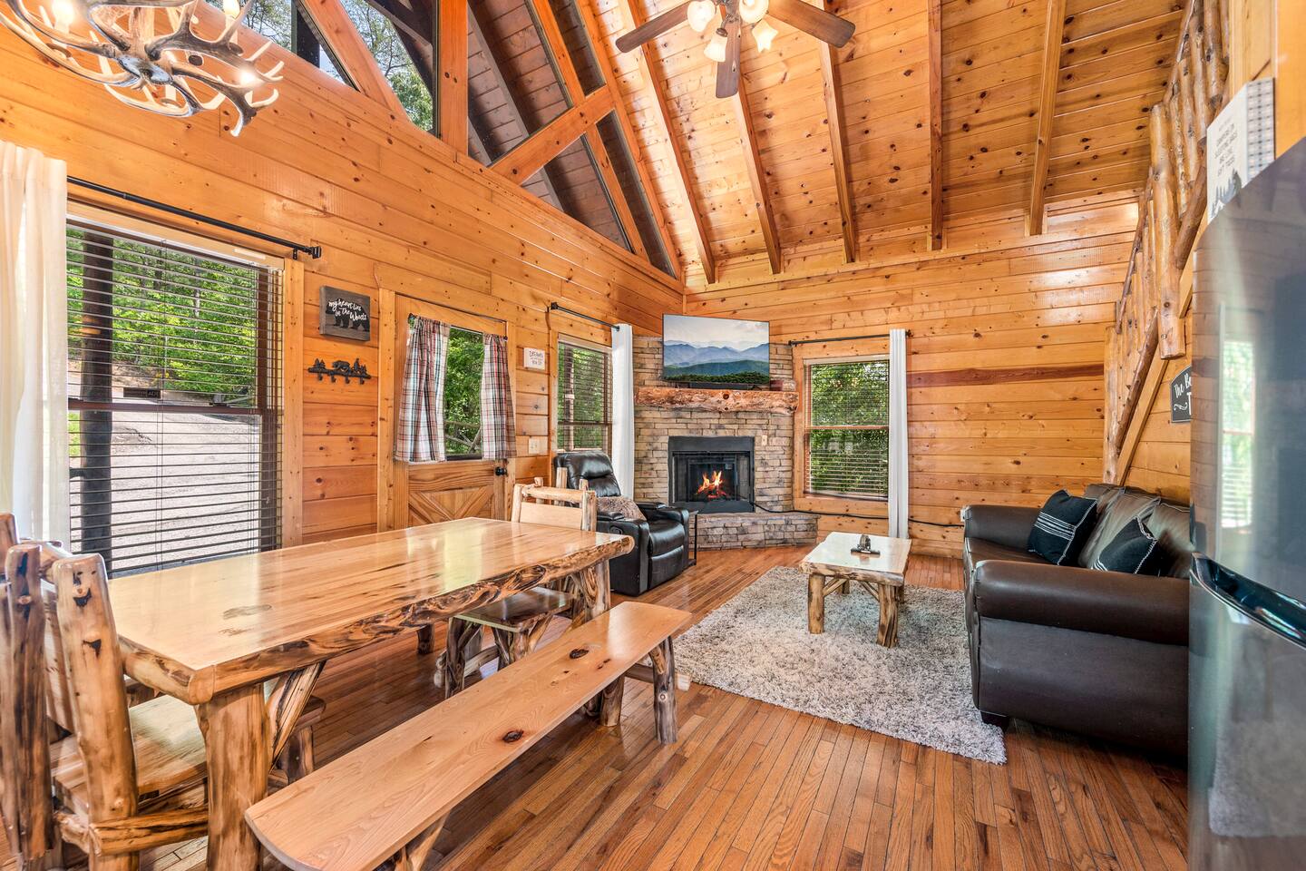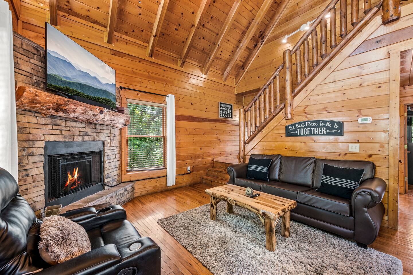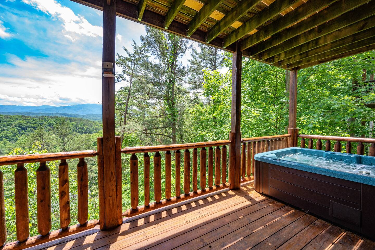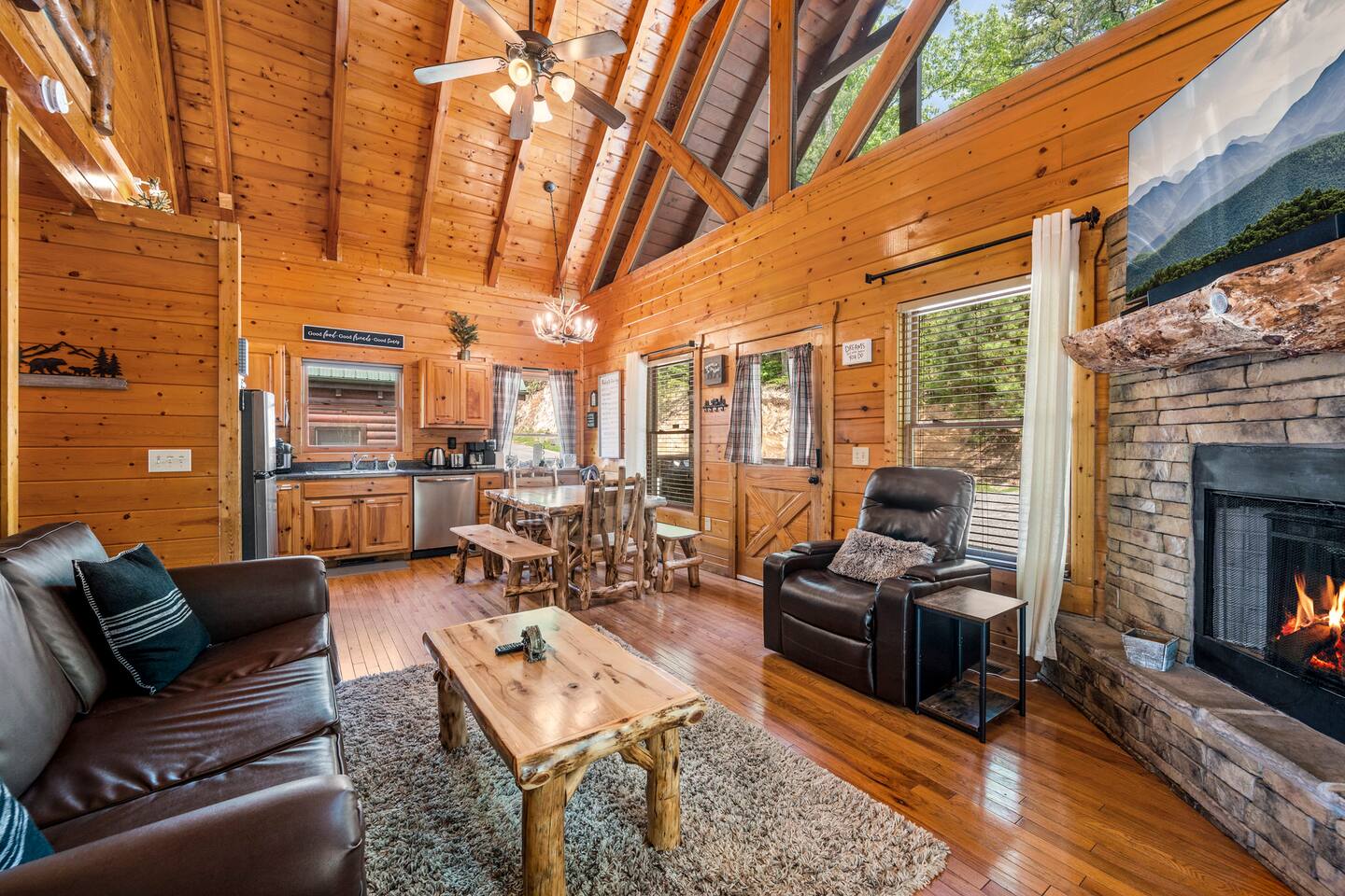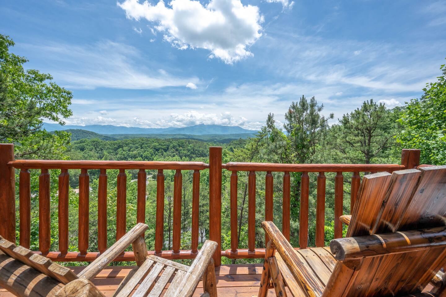 - 4-bedroom cabin with breathtaking views! - Sleeps 12 guests - Hot Tub - 10 minutes from all the action on the Parkway - Air Hockey table, Arcade Game, Smart TV's - High Speed WiFi - 3 Decks with amazing views - 3 King Beds, 1 Queen Bed, and 3 Sleeper Sofas - Fully equipped kitchen Prime location, yet nestled in the heart of nature, this cabin is the perfect retreat for families and groups looking for a peaceful and relaxing getaway. You and your family or group of 12 guests are going to love this cabin as it can accommodate a nice social gathering yet ensure the privacy you need while on vacation. Book now to experience the Smoky Mountains and all it has to offer with these incredible views. Conveniently located near Dollywood, Pigeon Forge and Gatlinburg, this 3 story home offers an Air Hockey Table, Arcade Game, 7 Smart TV's, and 3 decks to enjoy your Smokey Mountain Getaway from. The views are incredible from all three decks, which you can enjoy while relaxing in the 6 person hot tub, or from the Adirondack chairs with a nice beverage. The brand new hot tub is located out on the deck with a great view. It is drained, cleaned, and refilled before every stay. Inside, the cabin is fully furnished and equipped with all the amenities you need for a comfortable stay. The four bedrooms are cozy and inviting, with comfortable beds. The master bedroom even has its own private balcony, This home boasts a large master bedroom which encompasses the entire third floor, with more views, a king sized bed, jacuzzi tub, and a private balcony, perfect for enjoying a nightcap under the stars. The mainfloor features an open family room with a brand new large flatscreen Smart TV and sleeper sofa, fireplace, air hockey table, one queen bedroom and access to the balcony. On the lower level, you will find 2 king bedrooms, a tv/game room, and our deck with a hot tub. We have high Speed Xfinity Business Wifi, and Smart TV's located in every room for your enjoyment. Sleeping arrangements throughout the home includes 3 king beds (1 on the top floor, and 2 on the lower level), 1 queen bed (on the main floor), and 2 sofa beds (one on the main floor and one on the lower level) with linens and towels included. We also love kids, so we have stocked the home with a pack and play for your little one to sleep in, and a highchair so they can join you at the dinner table. The kitchen is fully equipped with modern appliances and everything you need to whip up a delicious meal for your family or friends. We also stock the home with soap and shampoo in every bathroom for your convenience. We have 2 charcoal grills available for use. With its stunning views, modern amenities, and unbeatable location, this 4-bedroom cabin is the perfect place to unwind and reconnect with nature. Book your stay today and start planning your dream vacation!